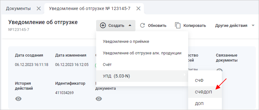 Нажмите кнопку «Создать» → «УПД (5.03-N)» → «СЧФДОП» или «ДОП» для неплательщиков НДС (Рис. 2).