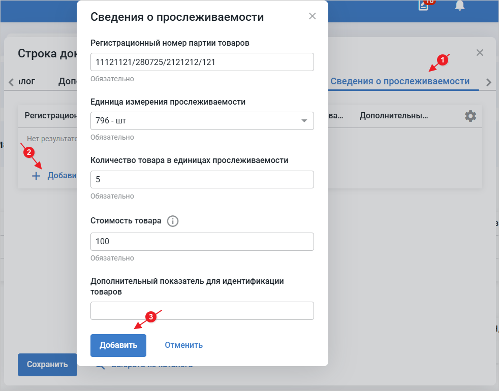 Для добавления информации перейдите во вкладку «Сведения о прослеживаемости», нажмите «Добавить» и заполните форму, затем нажмите «Добавить» (Рис. 10).