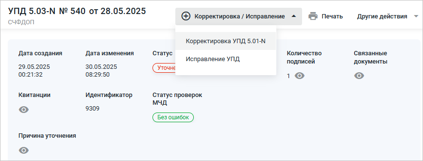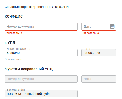 - «Корректировка» на УПД (СЧФДОП) должна иметь функцию «КСЧФДИС»
