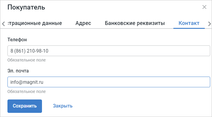 Откроется окно «Поставщик». Во вкладках «Регистрационные данные», «Адрес», «Фактический адрес», «Банковские реквизиты», «Контакт», «Почтовый адрес», «Подписант» заполните обязательные поля на примере заполнения реквизитов «Покупателя» (Рис. 6).