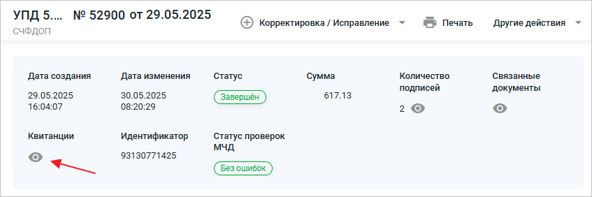 В режиме просмотра УПД нажмите кнопку «Просмотреть квитанции» (Рис. 6).