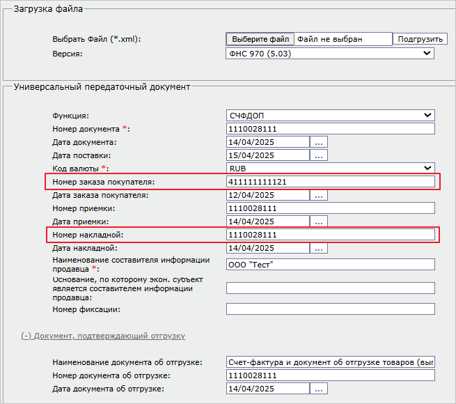 Откроется форма создания универсального передаточного документа. Проверьте заполнение в «шапке» документа обязательных полей:
