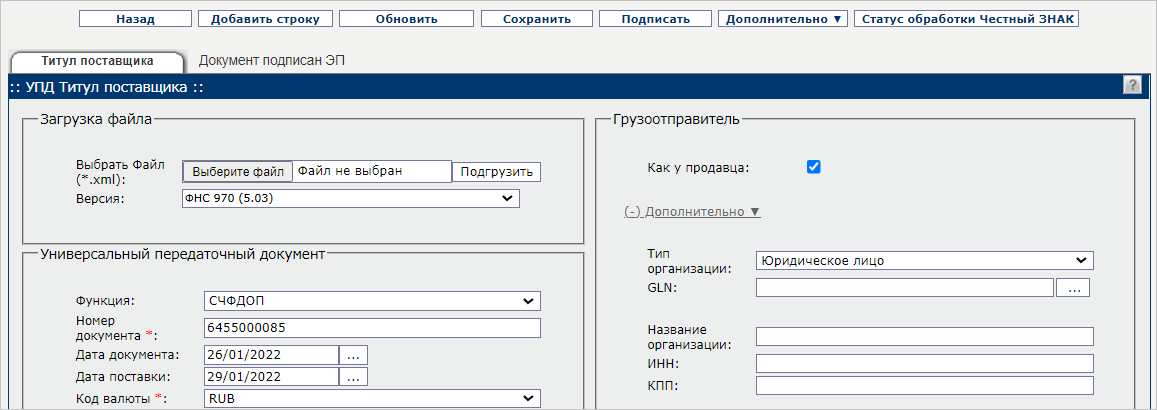 Все параметры указываются в форме «Инфополя». Инфополя могут отличаться в зависимости от требований контрагента к заполнению УПД (Рис. 2).