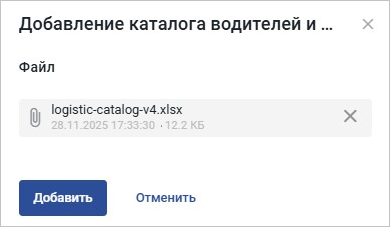 Нажмите кнопку «Добавить» → «Загрузить новый каталог водителей и ТС» (Рис. 11).