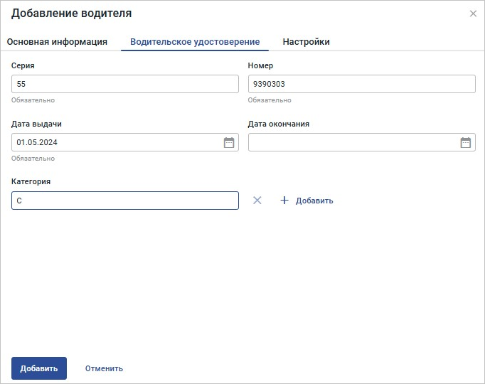 Далее перейдите во вкладку «Водительское удостоверение», укажите информацию и нажмите «Добавить» (Рис. 5).
