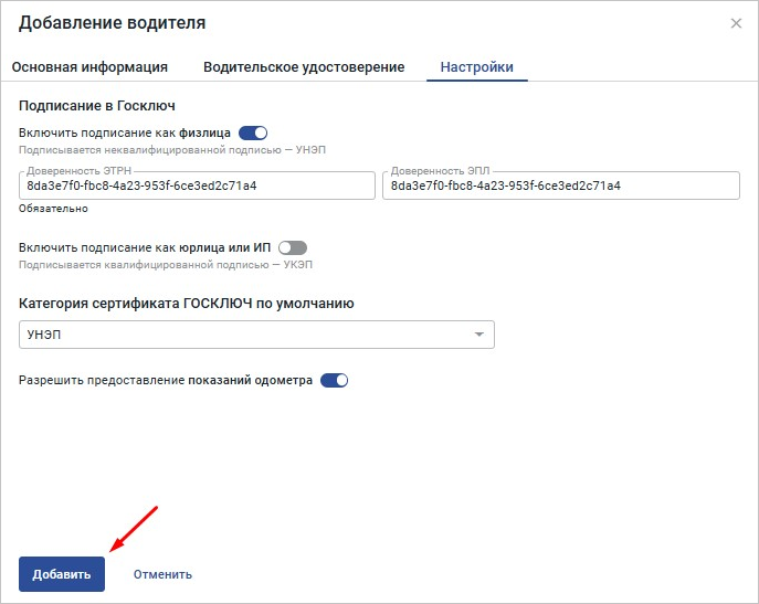 Во вкладке «Настройки» установите разрешения на подписание документов в Госключ и предоставление показаний одометра, затем нажмите «Добавить» (Рис. 6).