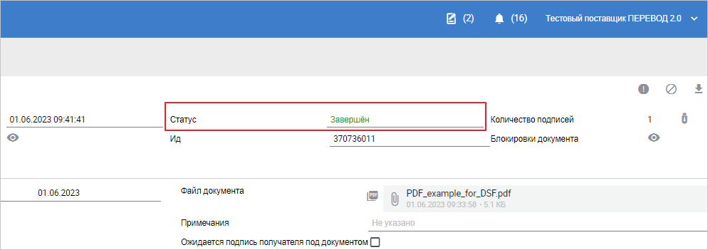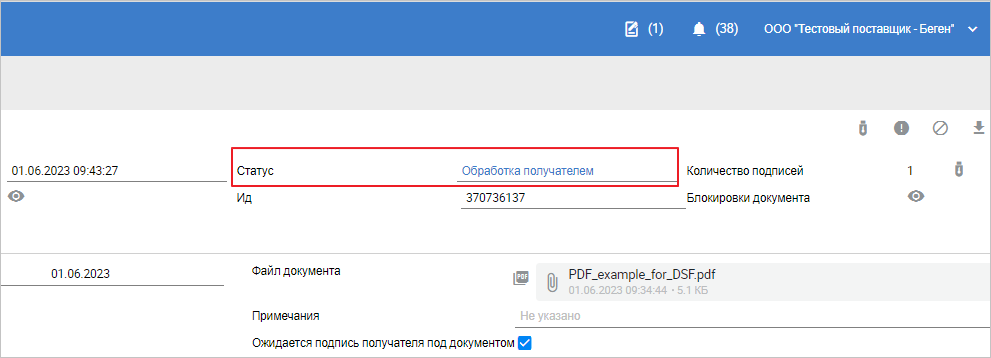 Если дополнительных действий со стороны получателя не требуется, статус ДСФ изменится на «Завершён». Если ожидается подпись получателя ДСФ, то статус документа изменится на «Обработка получателем» (Рис. 5).