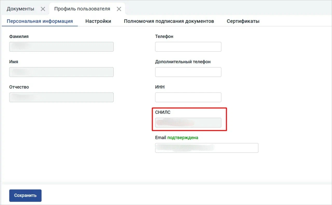 Проверьте заполнение СНИЛС в профиле пользователя (Рис. 2).