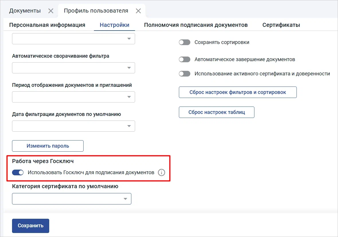 В профиле пользователя перейдите на вкладку «Настройки» отметьте поле «Использовать Госключ для подписания документов» (Рис. 3)