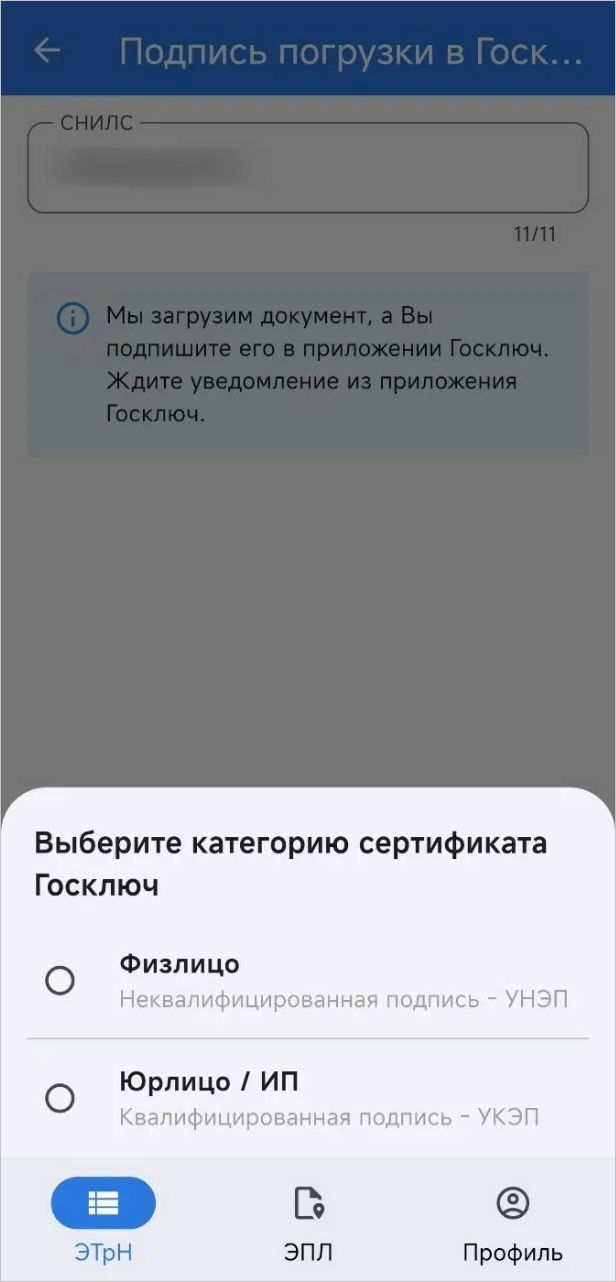 Далее укажите СНИЛС, который был указан в приложении «Госключ», затем нажмите кнопку «Отправить на подписание в Госключ» (Рис. 4).
