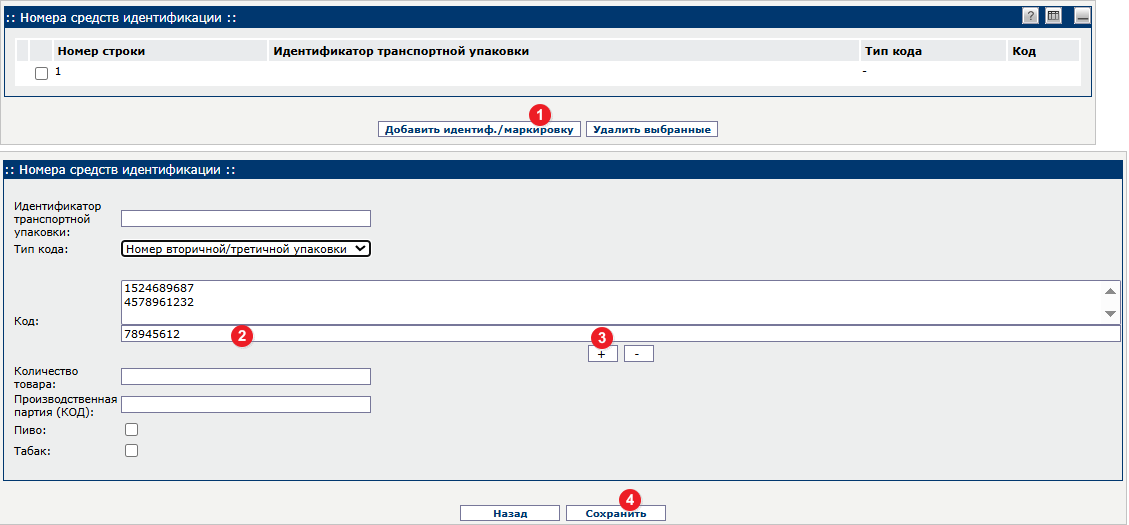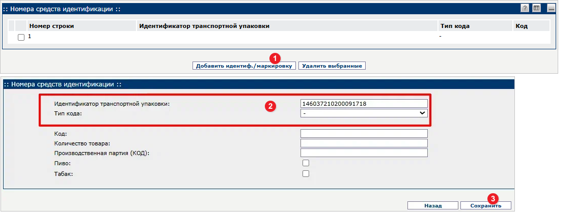 Если нужно указать КИЗ или номер вторичной/третичной упаковки, то в форме «Номера средств идентификации» нажмите кнопку «Добавить идентиф./маркировку», затем поле «Идентификатор транспортной упаковки» можно оставить пустым, а в полях «Тип кода» и «Код» укажите данные. Для добавления кода укажите значение в нижней строке, затем нажмите кнопку «Добавить». Значение перенесётся в верхнюю строку. После добавления всех кодов по товарной строке нажмите кнопку «Сохранить» (Рис. 22-б).