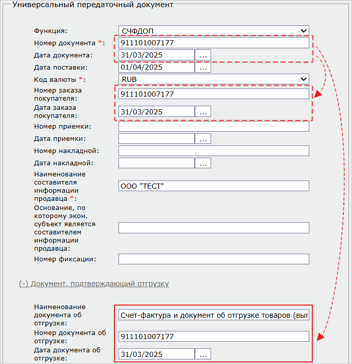 При создании УПД на основании ORDERS / DESADV / RECADV основные данные переносятся.