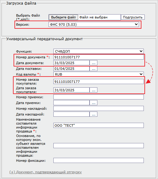 - Версия: ФНС 970 (5.03) – формат УПД 5.03