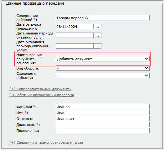 6. В блоке «Данные продавца о передаче» (Рис. 11):