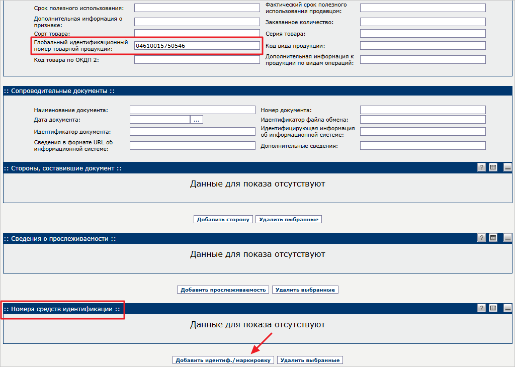Для заполнения информации о маркировке укажите ГТИН в поле «Глобальный идентификационный номер товарной продукции», затем в форме «Номера средств идентификации» нажмите кнопку «Добавить идентиф./маркировку» (Рис. 20):