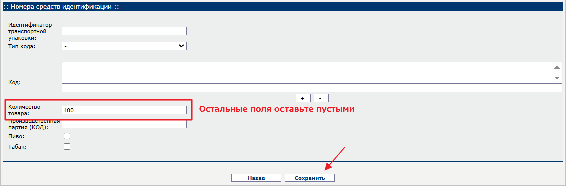 Откроется форма «Номера средств идентификации». Укажите количество и нажмите «Сохранить» (Рис. 21).