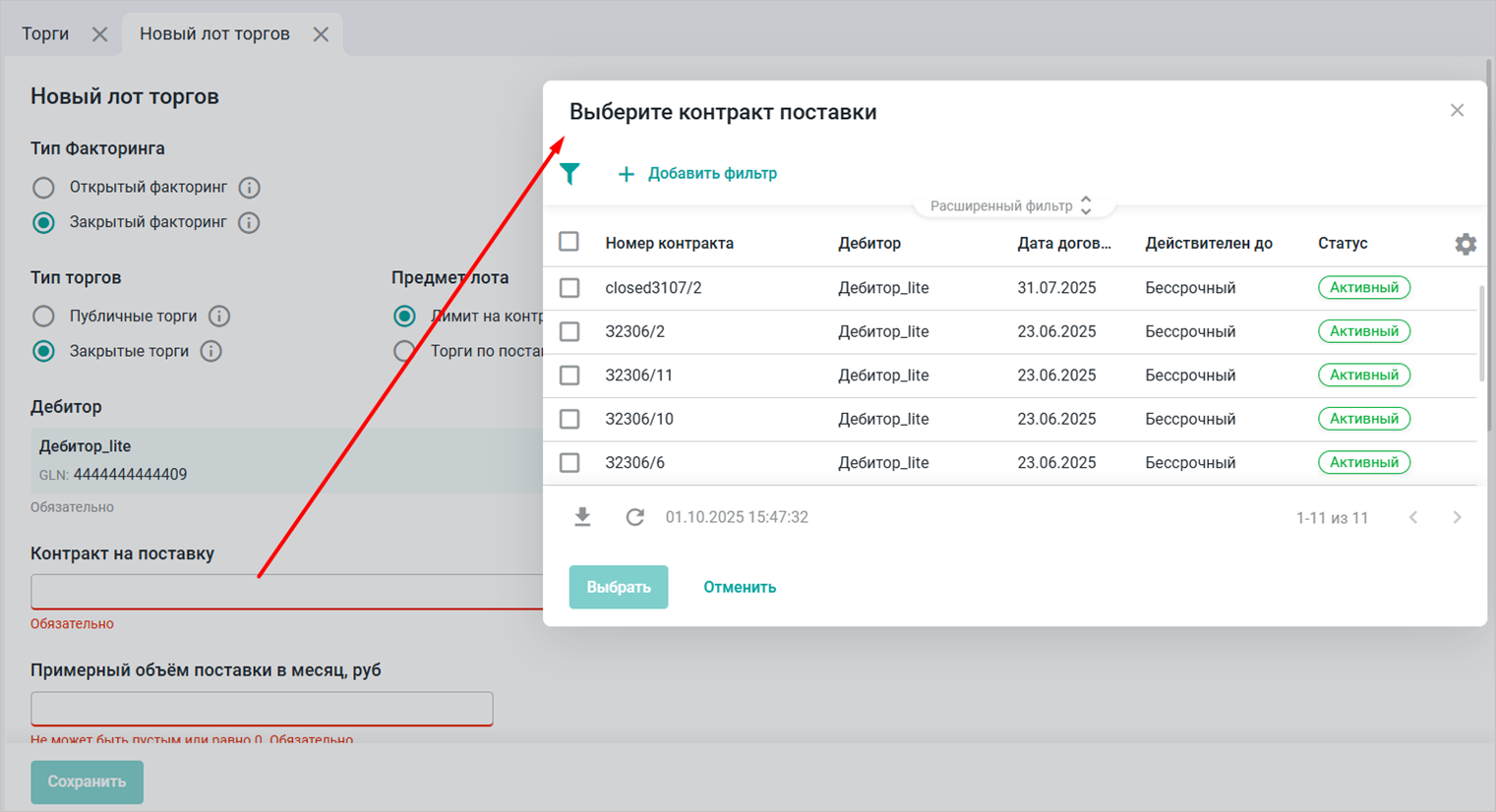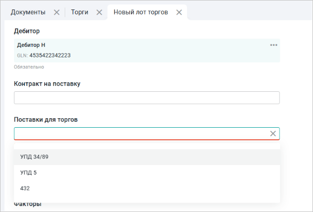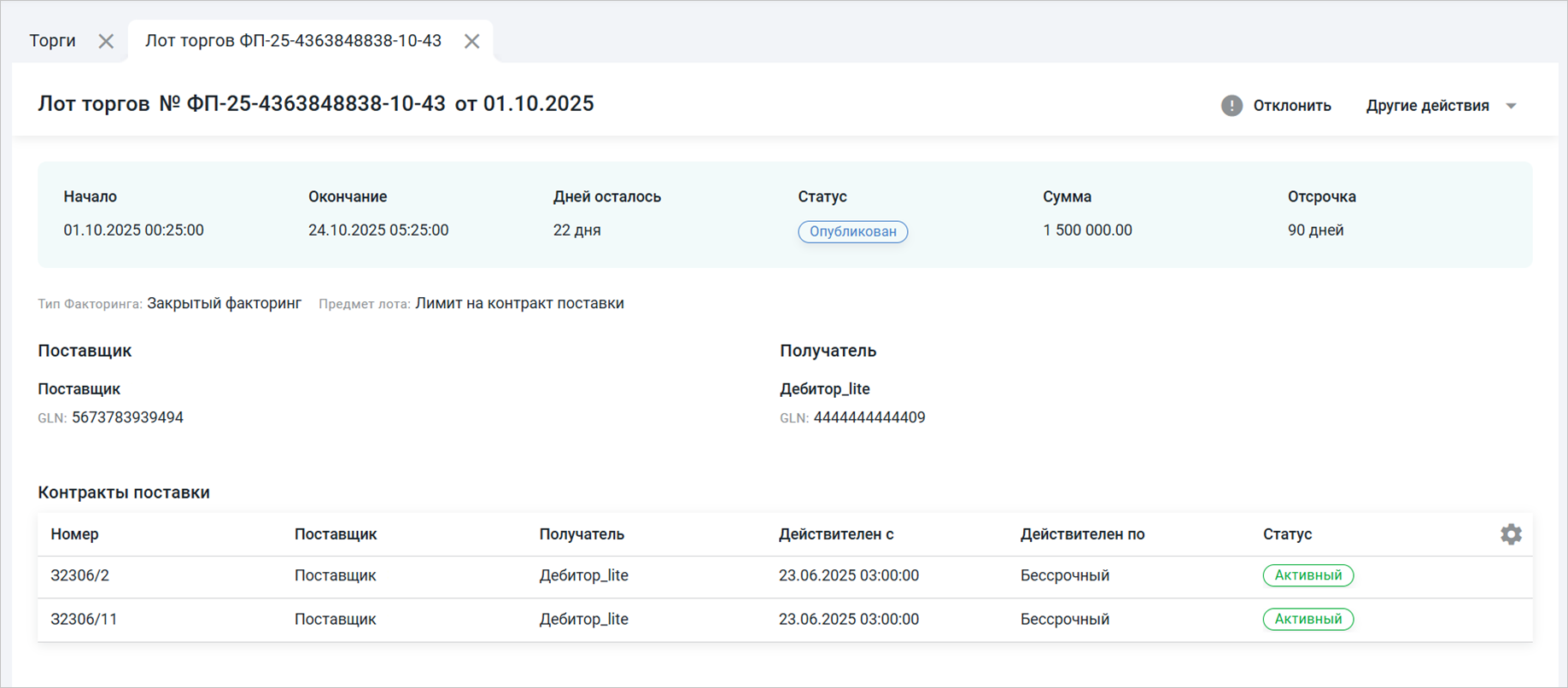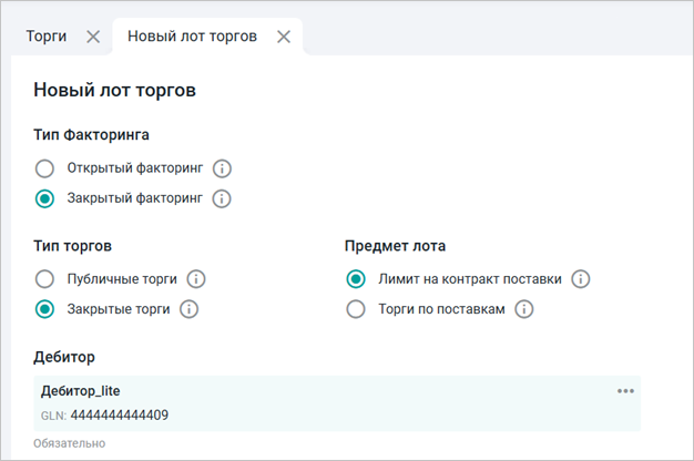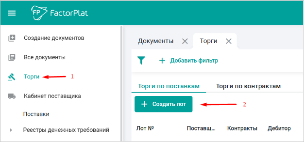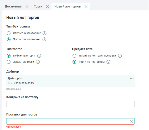 Торги по контрактам поставки доступны при открытом и закрытом типе факторинга. Торги по поставкам доступны только при закрытом факторинге.