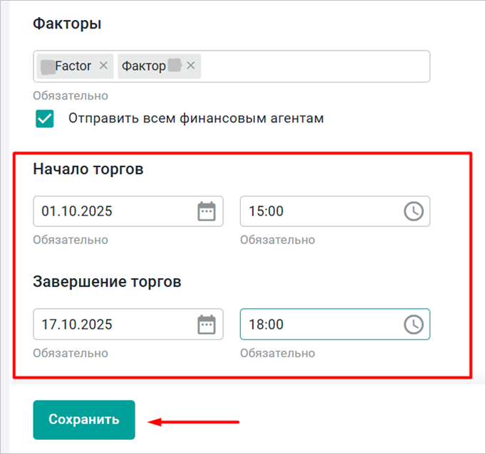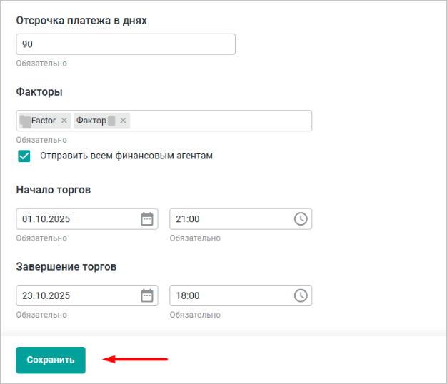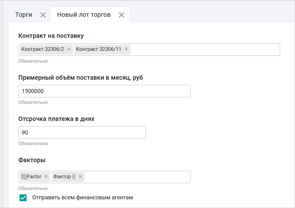 В списке отображаются все факторы, подключенные к маркетплейсу. При необходимости есть возможность отправить лот всем факторам с помощью чек-бокса «Отправить всем финансовым агентам»: поле «Факторы» заполнится автоматически с возможностью редактирования участников.