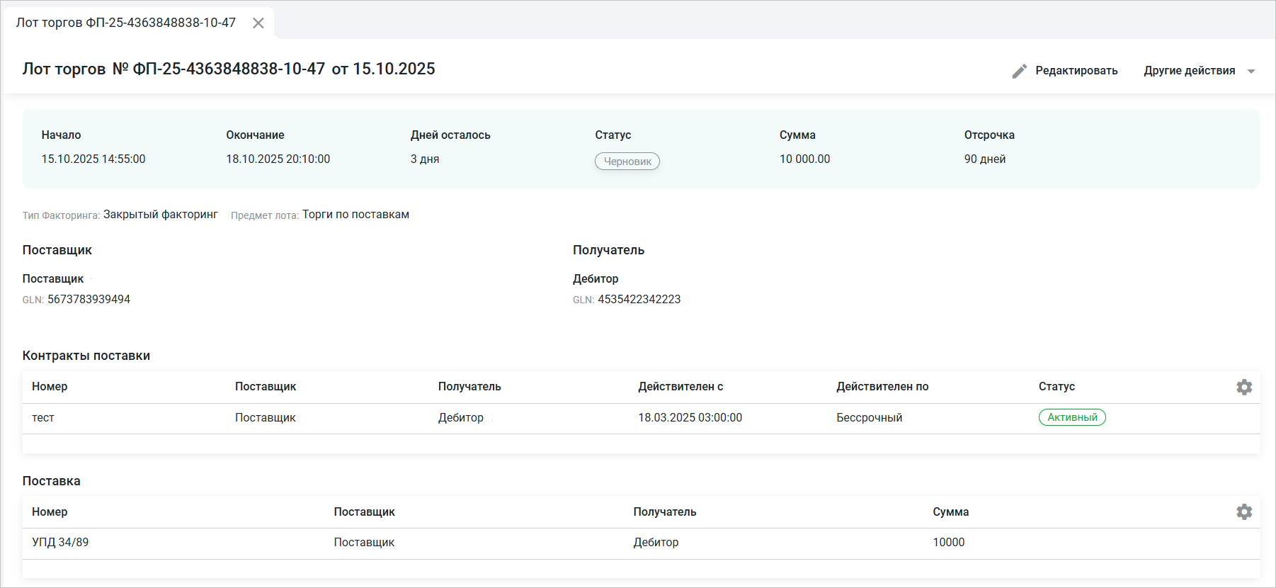Создастся лот торгов в статусе «Черновик», содержащий информацию о поставках на финансирование и контрактах на поставку, которые с ними связаны (Рис. 12).
