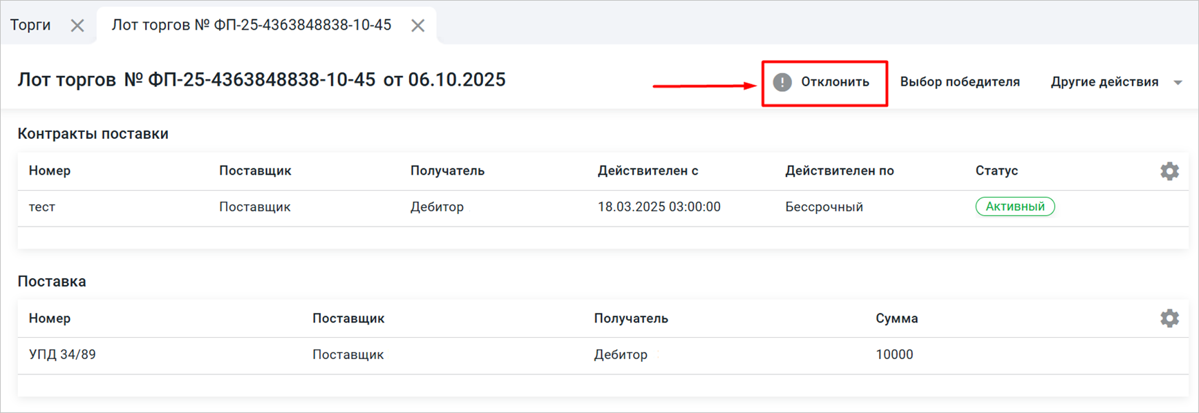 Откройте лот торгов, который требуется отклонить, и нажмите на кнопку «Отклонить» (Рис. 1).