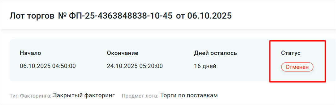 Лот торгов перейдёт в статус «Отменён» (Рис. 2).