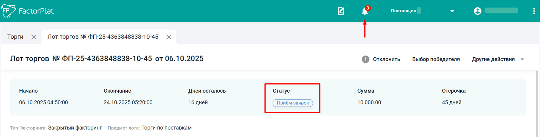 После получения первого предложения лот примет статус «Приём заявок», поступит «Уведомление о получении предложения от фактора» (Рис. 1).