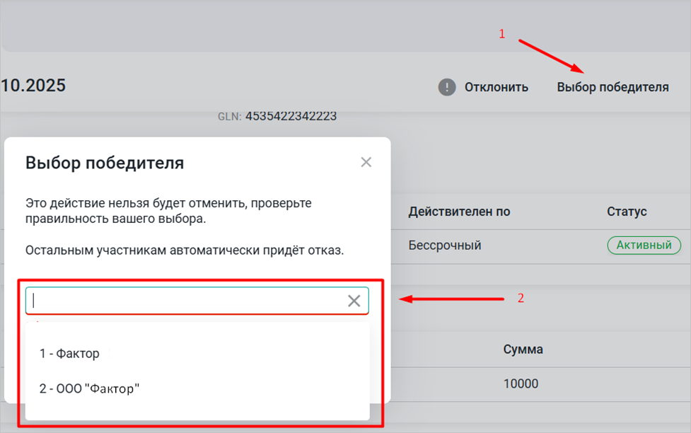 Если одно из полученных предложений о финансировании лота является подходящим, по кнопке «Выбор победителя» можно выбрать победителя досрочно, не дожидаясь окончания торгов. В выпадающем списке участников торгов выберите фактора, предложение которого наиболее оптимально (Рис. 3).