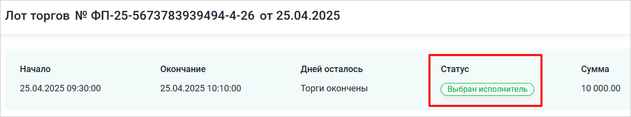 Лот торгов примет статус «Выбран исполнитель» (Рис. 5).