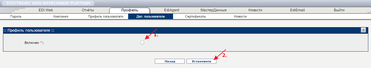 Для создания дополнительного пользователя на EDI Platform перейдите во вкладку «Профиль» → «Доп. пользователи» (Рис. 1).