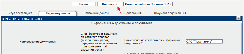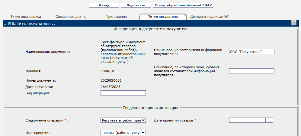 Откроется форма создания УПД «Титула покупателя» (Рис. 6).