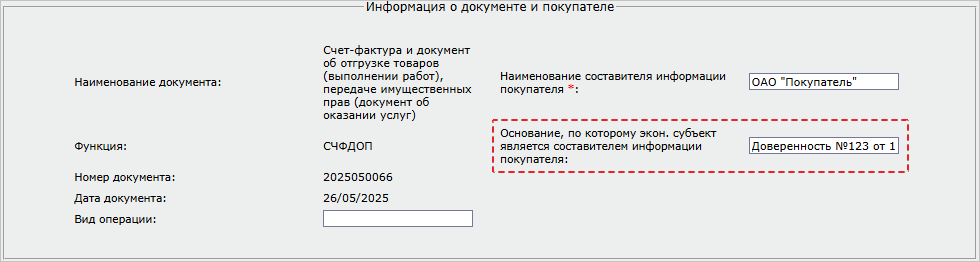 - Основание, по которому экон. субъект является составителем информации продавца – документ, на основании которого составитель документа имеет полномочия совершать действия. Значения – от «Доверенность №123 от 12.12.12», до «Должностная инструкция».