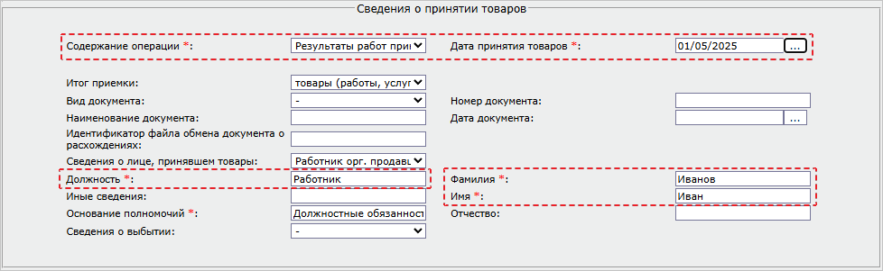 2. В блоке «Сведения о принятии товаров» (Рис. 8):