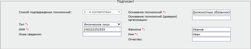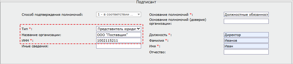 - Основание полномочий – основание, по которому субъект является подписантом.