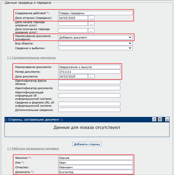 5. В блоке «Данные продавца о передаче» (Рис. 7):